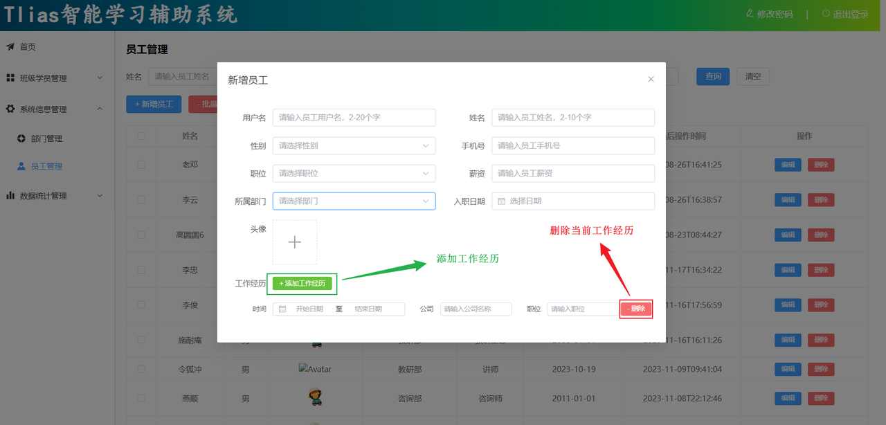 );(2)在 src/views/emp/index.vue 中的 <template> </template> 中的按钮绑定事件,并遍历展示工作经历信息