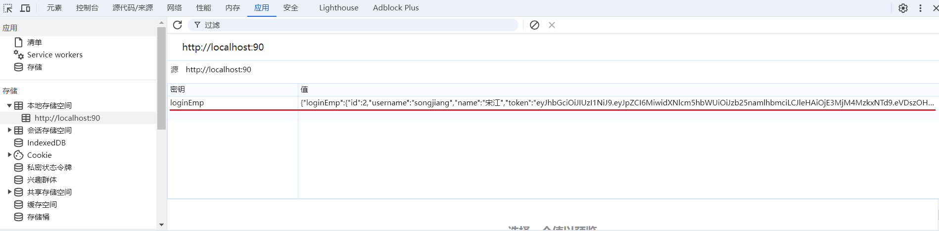 登录请求完成后,可以看到 JWT 令牌已经响应给了前端,此时前端就会将 JWT 令牌存储在浏览器本地