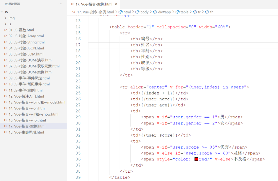 遍历的数组,必须在 data 中定义; 要想让哪个标签循环展示多次,就在哪个标签上使用 v-for 指令