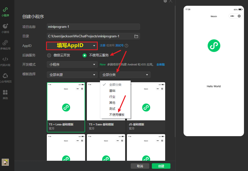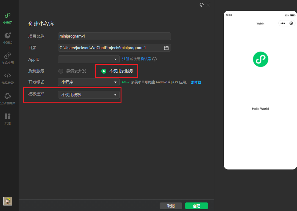 填写注册小程序的 AppID,并选择不使用云服务 --> 不使用模板