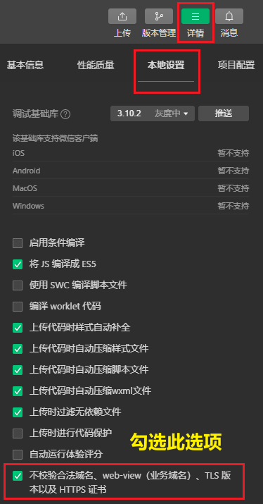 开发阶段,小程序发出请求到后端的 Tomcat 服务器,若不勾选,请求发送失败