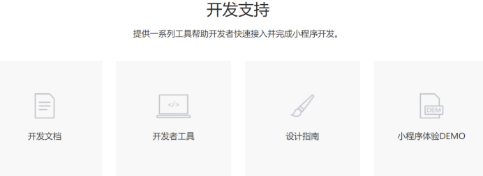 然后,微信小程序我们提供的一些开发的支持,实际上微信的官方是提供了一系列的工具来帮助开发者快速的接入,并且完成小程序的开发,提供了完善的开发文档,并且专门提供了一个开发者工具,还提供了相应的设计指南,同时也提供了一些小程序体验 DEMO,可以快速的体验小程序实现的功能