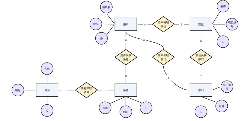 一共包含了 7 张表来进行权限控制:用户表、角色表、资源表、职位表、部门表。