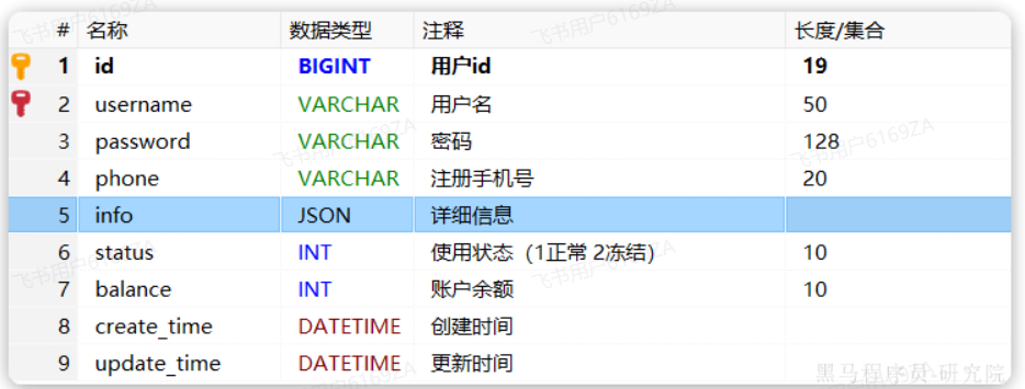 `info` JSON NOT NULL COMMENT '详细信息',