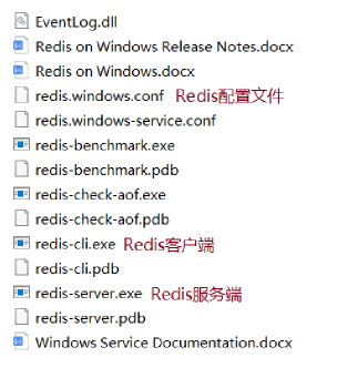Redis 的 Windows 版属于绿色软件,直接解压即可使用,解压后目录结构如下
