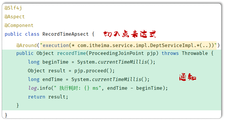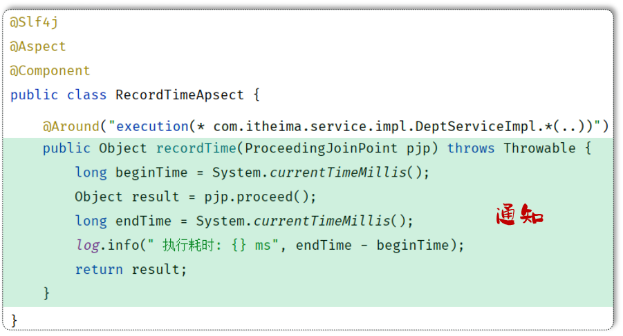 //其他方法省略...而这个功能如果通过 AOP 来实现,我们只需要单独定义下面这一小段代码即可,不需要修改原始的任何业务方法即可记录每一个业务方法的执行耗时
