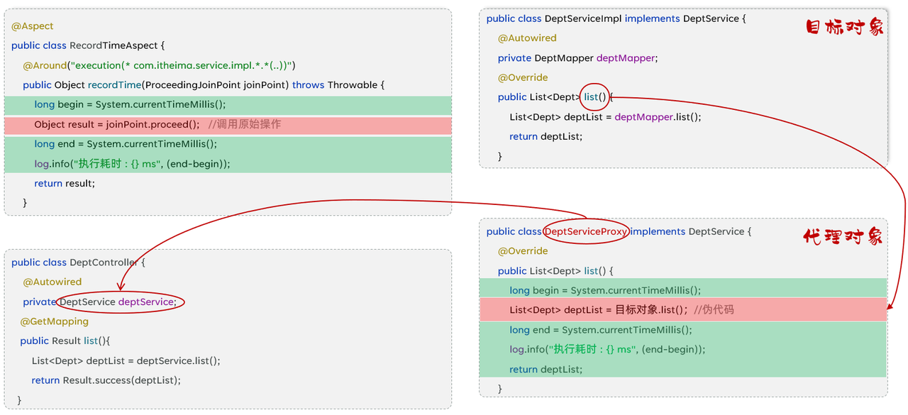 (2)在入门程序中是需要统计各个业务方法的执行耗时的,此时我们就需要在这些业务方法运行开始之前,先记录这个方法运行的开始时间,在每一个业务方法运行结束的时候,再来记录这个方法运行的结束时间