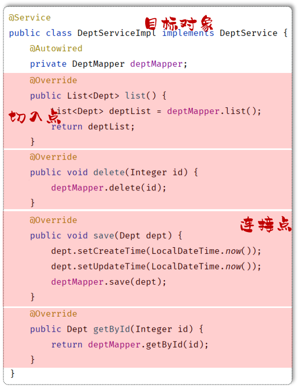 (1)连接点指的是可以被 aop 控制的方法(暗含方法执行时的相关信息),例如:入门程序当中所有的业务方法都是可以被 aop 控制的方法