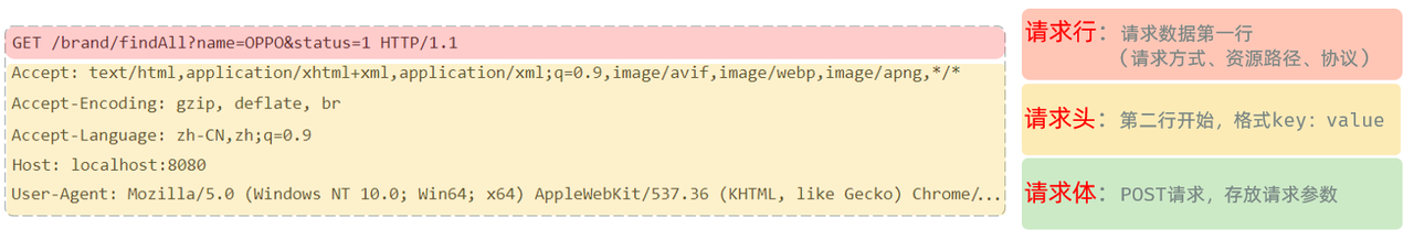 - 请求行(以上图中红色部分):包含请求方式、资源路径、协议/版本