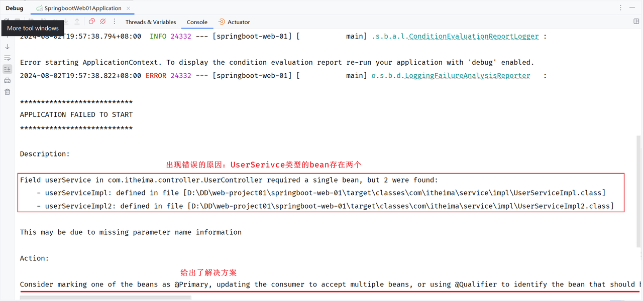 如果在 IOC 容器中,存在多个相同类型的 bean 对象。此时,我们启动项目会发现,控制台报错了
