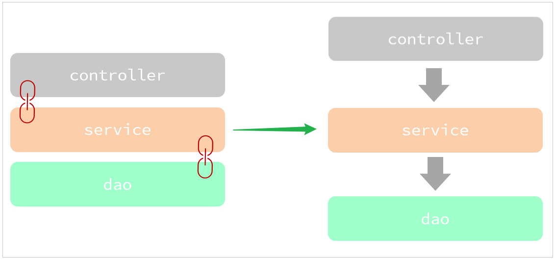 目前层与层之间是存在耦合的,Controller 耦合了 Service、Service 耦合了 Dao。而 高内聚、低耦合的目的是使程序模块的可重用性、移植性大大增强