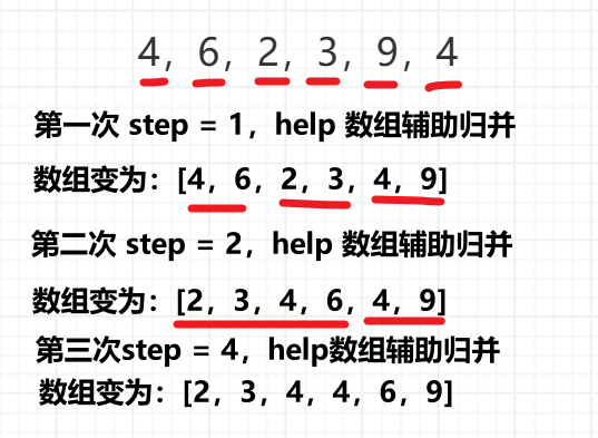 for 循环遍历数组,每次取 step 个元素,然后 merge,一轮结束后,step 翻了两倍,在第一次 merge 的基础上继续 merge