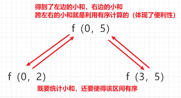 (2)使得该区间有序,目的是为了方便计算跨左右的小和,指针不回退的情况下便利一遍就可以统计跨左右的小和,加速求跨左右小和的值(体现了便利性)