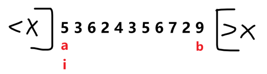 // 以中间值为标准划分, < x 的放在左边, > x 的放在右边