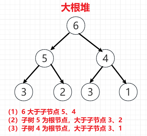 大根堆:任何一颗子树的根节点都大于子节点