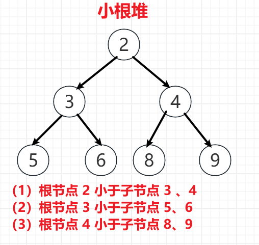 小根堆:任何一颗子树的根节点都小于子节点