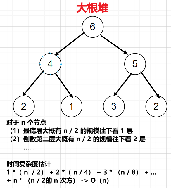 从底到顶建大根堆,每加入一个元素就需要往下调整,根据如下对元素的规模分析可以推算建堆的时间复杂度