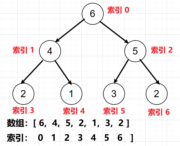 堆中元素位置与数组中元素位置的关系:从索引 0 开始,在堆中从上到下,从左到右,依次排列 0 - n-1 位置的元素