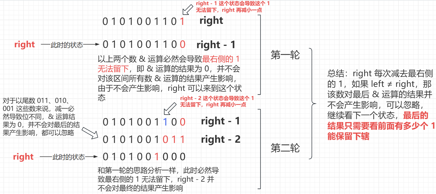 left 到 right 这个区间的是连续的,每次让 right 减一,二进制位中也会减去 1,得到的结果记为 a,则 a 必定在 left 到 right 这个区间中,而这个状态的存在必定会导致 right(即减一之前的数) 的二进制位中最右侧的 1 无法留下(同为 1, & 运算的结果为 1,而减一必然导致两个数的同一个二进制位不同,& 的结果必然为 0),right 继续减小