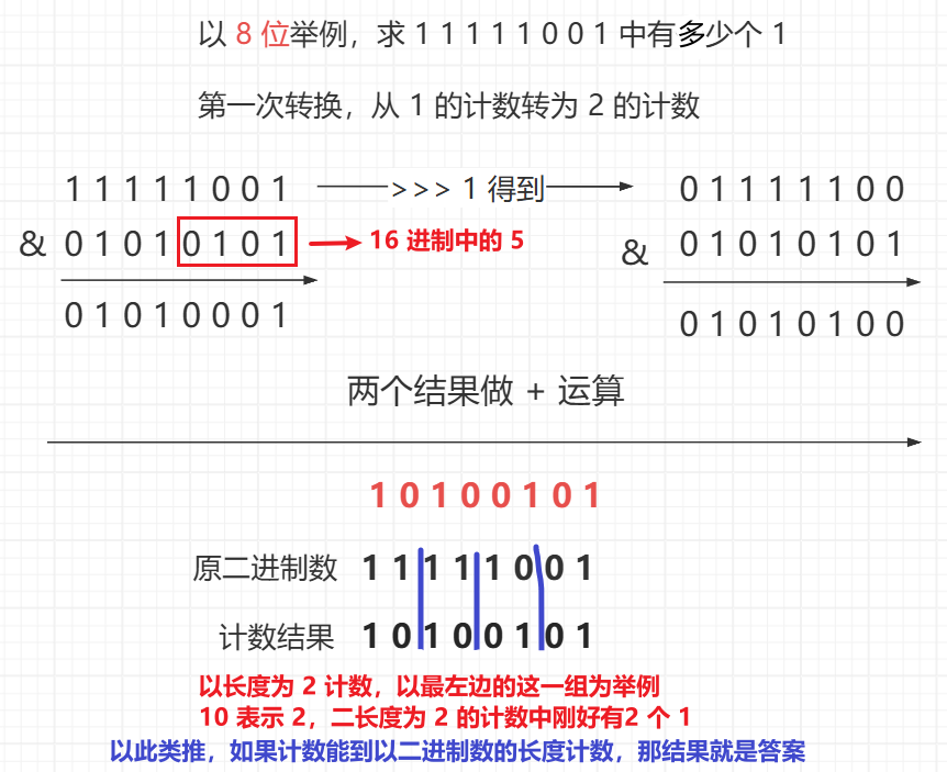 第三步:将前两次操作的结果相加,即以 2 为计数,两次操作分别计算了这两位中 1 的个数,累加就是以 2 为计数,这两个数中有多少个 1 的结果