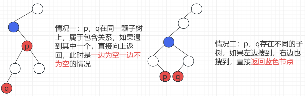// 情况一:p,q 属于包含关系,在同一颗子树上