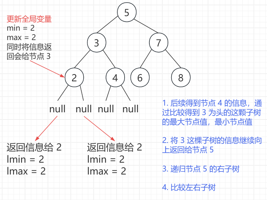 每棵子树的左子树,右子树的最大和最小分别用局部变量接收,将信息返回给子树的根节点