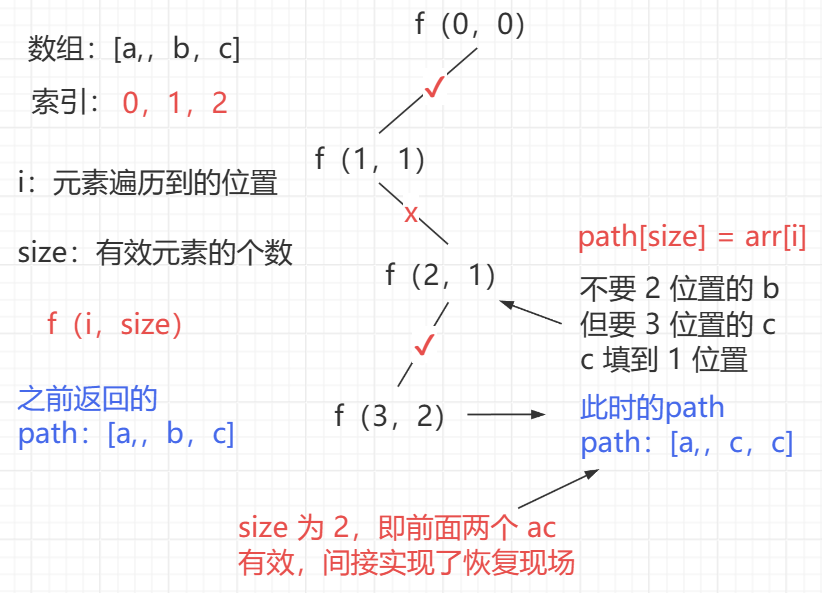 通过数组的复用和 i 变量,以及 size 控制有效元素的个数,在递归的过程中可以实现元素擦除,后面的元素会覆盖前面的元素,间接实现了恢复现场,无需手动控制