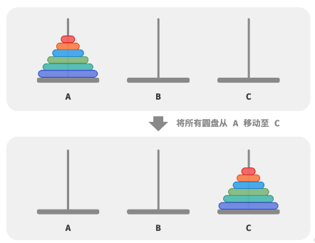 三根柱子 A、B、C,柱子上有大小不同的圆盘,初始时所有圆盘在 A 柱子上
