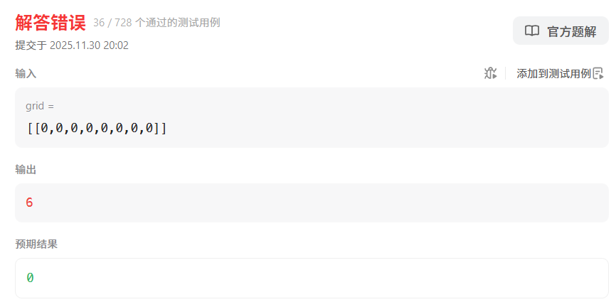 result、count 是全局共享的,如果之前跑过别的测试(比如某个岛屿面积是 6),再跑这个全 0 的 grid,因为没有遇到 1,所以这次不会更新 result(),result 就保留了上次的值 6
