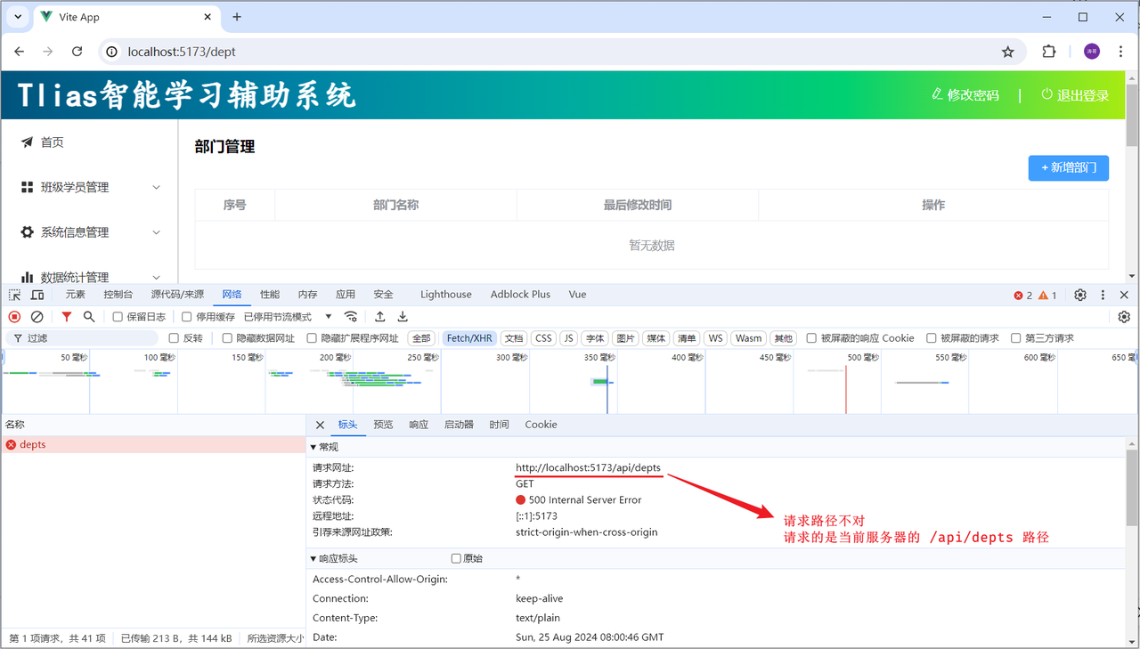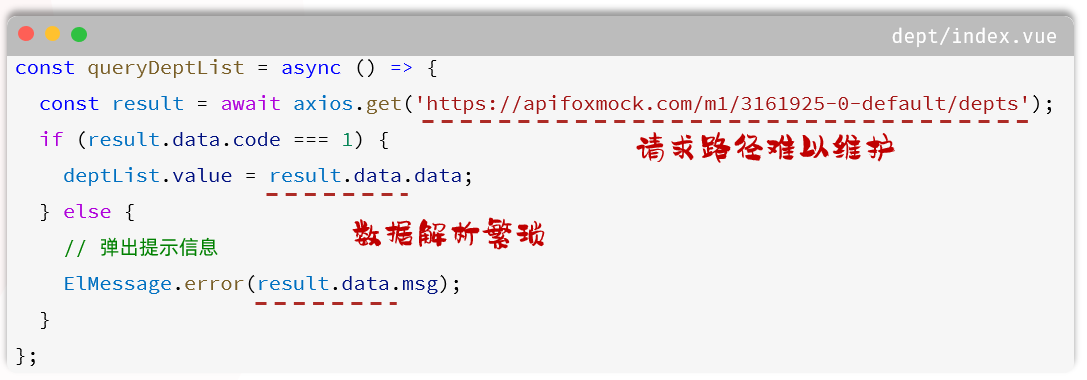 我们刚才在完成部门列表查询时,是直接基于 axios 发送异步请求,直接将接口的请求地址放在组件文件 .vue 中。 而如果开发一个大型的项目,组件文件可能会很多很多很多,如果前端开发完毕,进行前后端联调测试了,需要修改请求地址,那么此时,就需要找到每一个 .vue 文件,然后挨个修改。 所以上述的代码,虽然实现了动态加载数据的功能。 但是存在以下问题