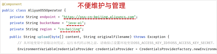 在刚才我们制作的 AliyunOSS 操作的工具类中,我们直接将 endpoint、bucketName 参数直接在 java 文件中写死了