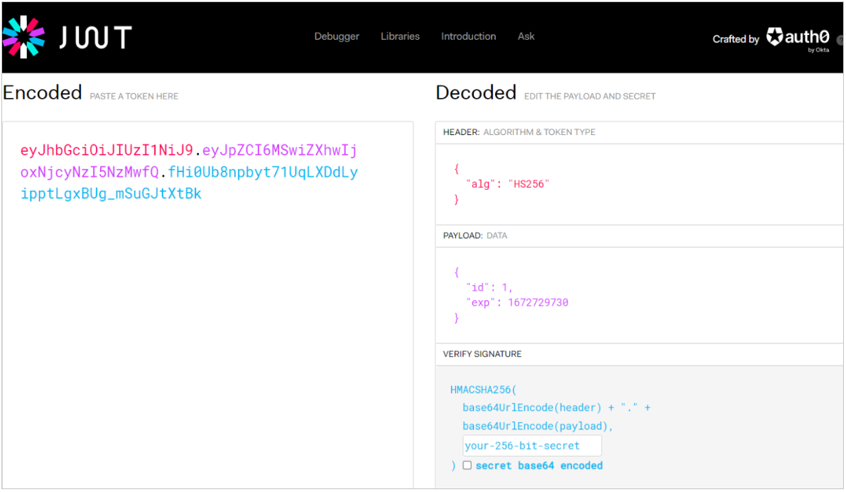 eyJhbGciOiJIUzI1NiJ9.eyJpZCI6MSwiZXhwIjoxNjcyNzI5NzMwfQ.fHi0Ub8npbyt71UqLXDdLyipptLgxBUg_mSuGJtXtBk输出的结果就是生成的 JWT 令牌,,通过英文的点分割对三个部分进行分割,我们可以将生成的令牌复制一下,然后打开 JWT 的官网,将生成的令牌直接放在 Encoded 位置,此时就会自动的将令牌解析出来