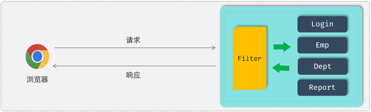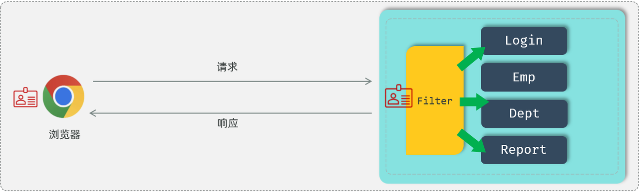 使用了过滤器之后,要想访问 web 服务器上的资源,必须先经过滤器,过滤器处理完毕之后,才可以访问对应的资源