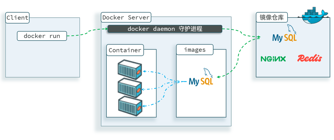 Docker 本身包含一个后台服务,我们可以利用 Docker 命令告诉 Docker 服务,帮助我们快速部署指定的应用。Docker 服务部署应用时,首先要去搜索并下载应用对应的镜像,然后根据镜像创建并允许容器,应用就部署完成了