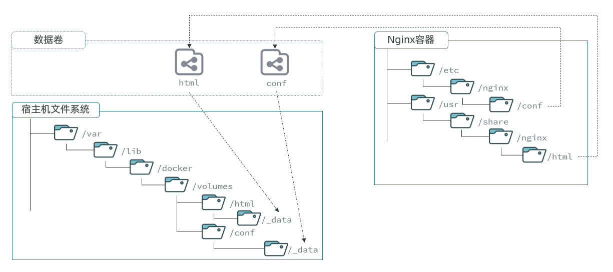 Nginx 容器内部的 conf 目录和 html 目录分别与两个数据卷关联。