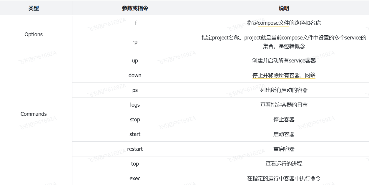 docker compose [OPTIONS] [COMMAND]其中,OPTIONS 和 COMMAND 都是可选参数,比较常见的有