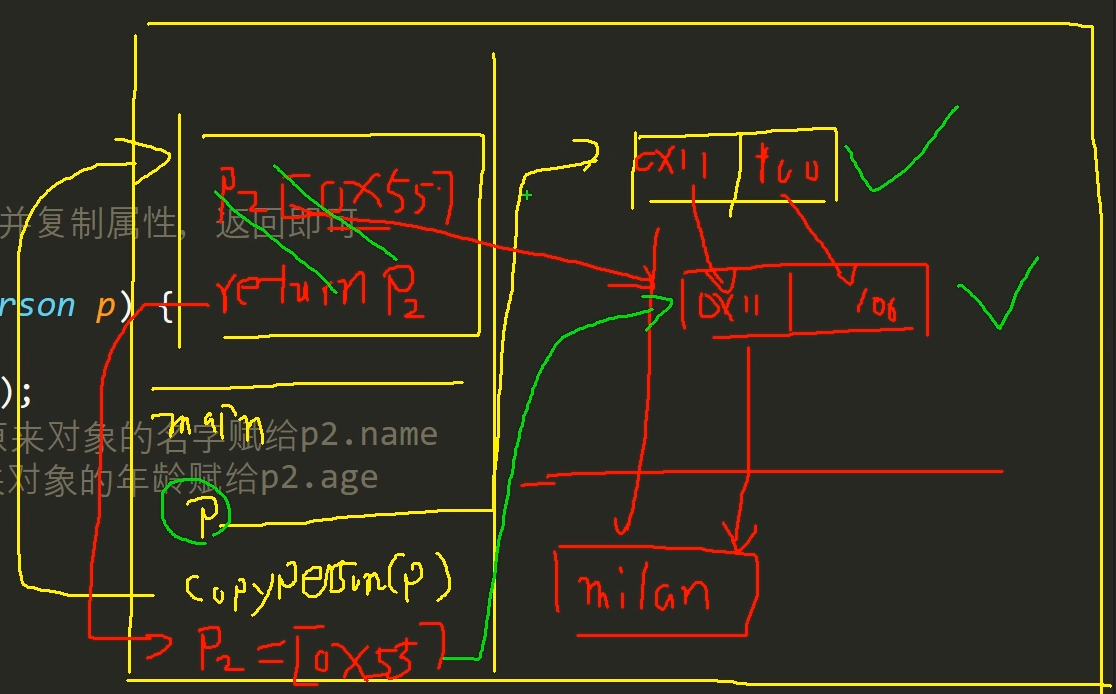 (4)方法执行完成,返回 p1 的地址,由于在主栈中用变量接收了返回值,即新的堆空间得到了引用,该堆空间不会当作垃圾进行回收,拷贝完成