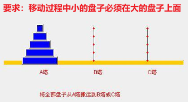 在一根柱子上从下往上按照大小顺序摞着 64 片圆盘。大梵天命令婆罗门把圆盘从下面开始按大小顺序重新摆放在另一根柱子上。并且规定,在小圆盘上不能放大圆盘,在三根柱子之间一次只能移动一个圆盘。