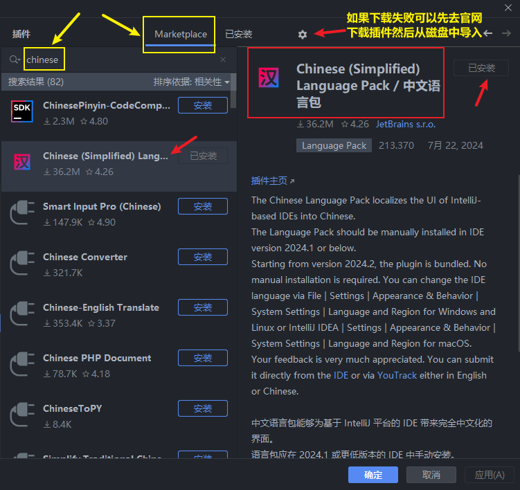 ctrl + alt + s 打开设置,找到 Plugins,在 Markplace 中搜索 Chinese,点击下载后根据提示重启IDEA即可