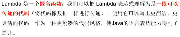 只要一个对象是函数式接口的实例,那么该对象就可以用 lambda 表达式来表示(原先采用创建一个匿名内部类对象来实现)